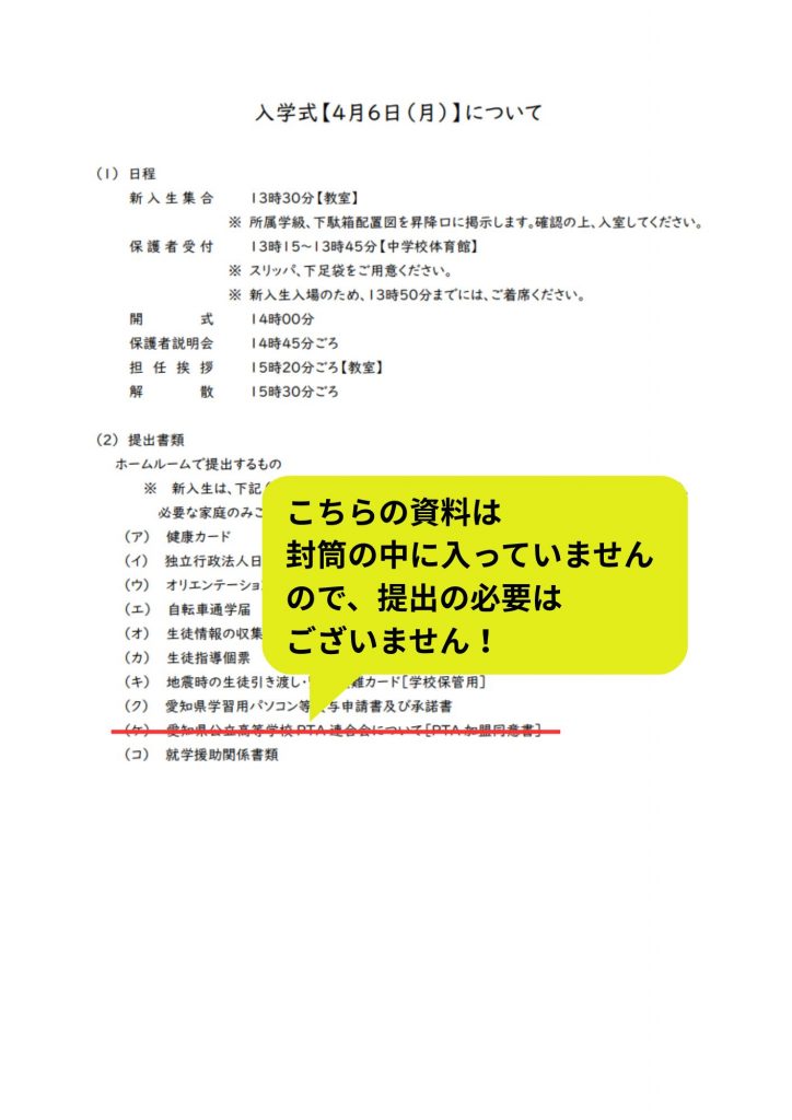 入学式にご提出いただく書類について、こちらの不備により封筒に入っていないものが「提出書類」一覧に記載されていましたので、お詫び申し上げます。